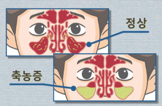 흔히 '충농증'이라고 하는 질환입니다. 얼굴의 부비동이라는 공간에 세균이나 바이러스가 침투하여 생기게 됩니다. 4~5월 환절기에 많이 발생하며, 감기가 오래지속되면 부비동염으로 이어지기도 합니다.