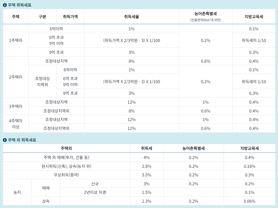 소유자산의 개수와 종류에 따라 상기 표에 나와있는 세율을 취득가액 기준으로 계산하여 납부하면 됩니다.